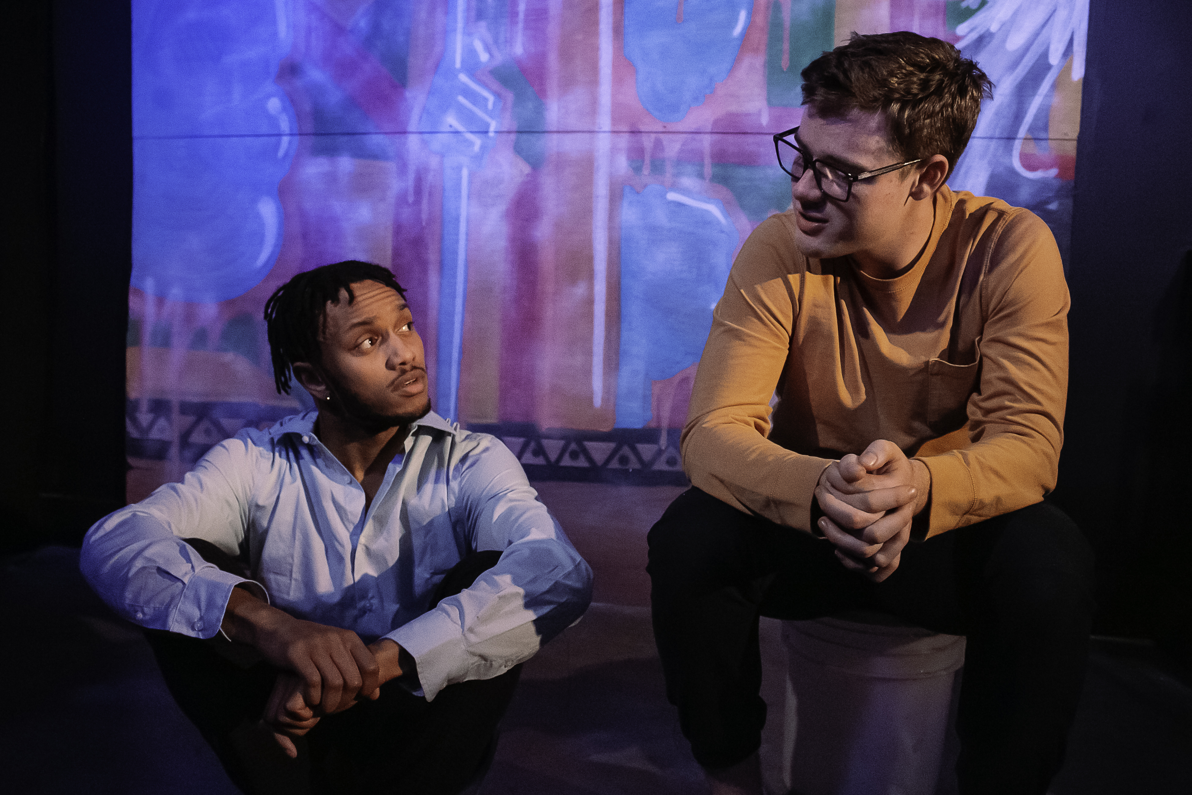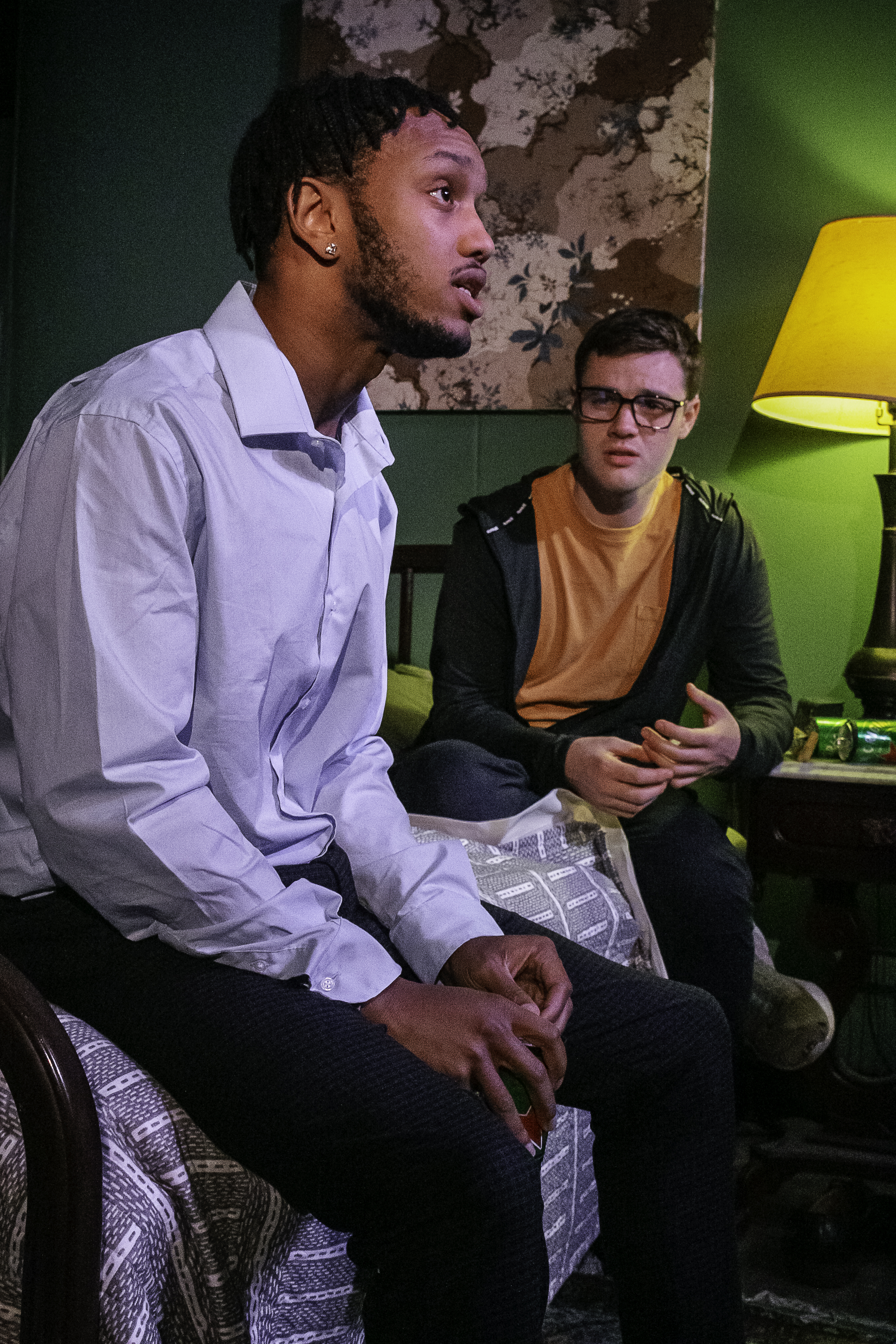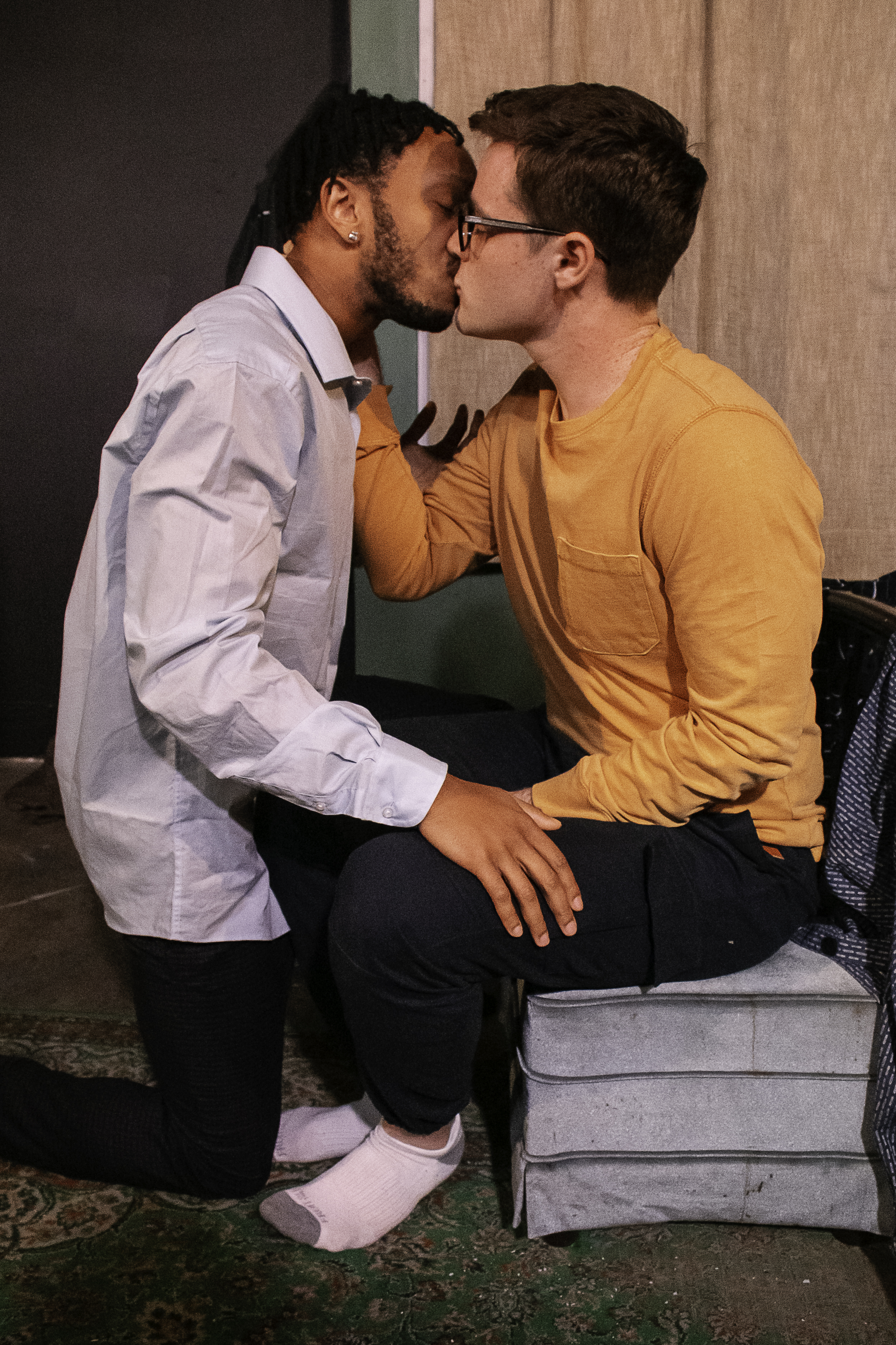 (Pictured l. to r.) Jordan Covington plays “Nicholas” in the Theatre Rhinoceros production of A GUIDE FOR THE HOMESICK by Ken Urban, directed by Alan S. Quismorio, Feb. 23-Mar. 19, at 4229 18th St. in San Francisco. Photo by Vince Thomas.